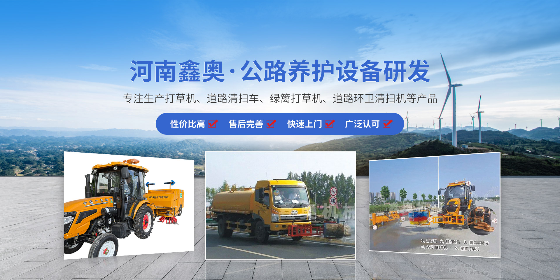 河南鑫奧機械制造有限公司位于“森林城市”京廣鐵路大動脈貫穿而過的新鄉。是一家生產打草機、道路清掃車、綠籬打草機、道路環衛清掃機等產品的公司,集研發、制造、營銷及技術服務為一體的新技術企業。自2000年開始從事公路養護設備的研制開發與生產。于2007年通過資產組合成立了河南鑫奧機械制造有限公司。  我公司近年來堅持“鑫奧機械,源于公路”的理念,針對公路建設養護所需,我們的科技團隊先后研制了道路環......